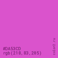 Цвет #DA53CD в цветовой модели RGB обозначается тремя октетами (218, 83, 205) в десятичном формате и #DA53CD в шестнадцатиричном (hex) формате, которые являются интенсивностью красного 218 (hex DA), интенсивность зелёного 83 (hex 53) и интенсивность синего 205 (hex CD).