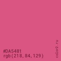 Цвет #DA5481 в цветовой модели RGB обозначается тремя октетами (218, 84, 129) в десятичном формате и #DA5481 в шестнадцатиричном (hex) формате, которые являются интенсивностью красного 218 (hex DA), интенсивность зелёного 84 (hex 54) и интенсивность синего 129 (hex 81).
