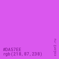 Цвет #DA57EE в цветовой модели RGB обозначается тремя октетами (218, 87, 238) в десятичном формате и #DA57EE в шестнадцатиричном (hex) формате, которые являются интенсивностью красного 218 (hex DA), интенсивность зелёного 87 (hex 57) и интенсивность синего 238 (hex EE).