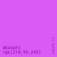 Цвет #DA5AF5 в цветовой модели RGB обозначается тремя октетами (218, 90, 245) в десятичном формате и #DA5AF5 в шестнадцатиричном (hex) формате, которые являются интенсивностью красного 218 (hex DA), интенсивность зелёного 90 (hex 5A) и интенсивность синего 245 (hex F5).