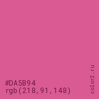 Цвет #DA5B94 в цветовой модели RGB обозначается тремя октетами (218, 91, 148) в десятичном формате и #DA5B94 в шестнадцатиричном (hex) формате, которые являются интенсивностью красного 218 (hex DA), интенсивность зелёного 91 (hex 5B) и интенсивность синего 148 (hex 94).