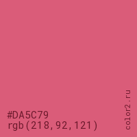 Цвет #DA5C79 в цветовой модели RGB обозначается тремя октетами (218, 92, 121) в десятичном формате и #DA5C79 в шестнадцатиричном (hex) формате, которые являются интенсивностью красного 218 (hex DA), интенсивность зелёного 92 (hex 5C) и интенсивность синего 121 (hex 79).