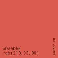 Цвет #DA5D50 в цветовой модели RGB обозначается тремя октетами (218, 93, 80) в десятичном формате и #DA5D50 в шестнадцатиричном (hex) формате, которые являются интенсивностью красного 218 (hex DA), интенсивность зелёного 93 (hex 5D) и интенсивность синего 80 (hex 50).