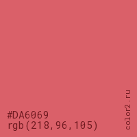 Цвет #DA6069 в цветовой модели RGB обозначается тремя октетами (218, 96, 105) в десятичном формате и #DA6069 в шестнадцатиричном (hex) формате, которые являются интенсивностью красного 218 (hex DA), интенсивность зелёного 96 (hex 60) и интенсивность синего 105 (hex 69).