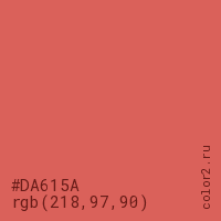 Цвет #DA615A в цветовой модели RGB обозначается тремя октетами (218, 97, 90) в десятичном формате и #DA615A в шестнадцатиричном (hex) формате, которые являются интенсивностью красного 218 (hex DA), интенсивность зелёного 97 (hex 61) и интенсивность синего 90 (hex 5A).