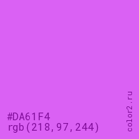 Цвет #DA61F4 в цветовой модели RGB обозначается тремя октетами (218, 97, 244) в десятичном формате и #DA61F4 в шестнадцатиричном (hex) формате, которые являются интенсивностью красного 218 (hex DA), интенсивность зелёного 97 (hex 61) и интенсивность синего 244 (hex F4).