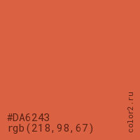 Цвет #DA6243 в цветовой модели RGB обозначается тремя октетами (218, 98, 67) в десятичном формате и #DA6243 в шестнадцатиричном (hex) формате, которые являются интенсивностью красного 218 (hex DA), интенсивность зелёного 98 (hex 62) и интенсивность синего 67 (hex 43).