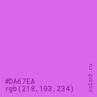 Цвет #DA67EA в цветовой модели RGB обозначается тремя октетами (218, 103, 234) в десятичном формате и #DA67EA в шестнадцатиричном (hex) формате, которые являются интенсивностью красного 218 (hex DA), интенсивность зелёного 103 (hex 67) и интенсивность синего 234 (hex EA).