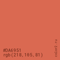 Цвет #DA6951 в цветовой модели RGB обозначается тремя октетами (218, 105, 81) в десятичном формате и #DA6951 в шестнадцатиричном (hex) формате, которые являются интенсивностью красного 218 (hex DA), интенсивность зелёного 105 (hex 69) и интенсивность синего 81 (hex 51).