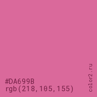 Цвет #DA699B в цветовой модели RGB обозначается тремя октетами (218, 105, 155) в десятичном формате и #DA699B в шестнадцатиричном (hex) формате, которые являются интенсивностью красного 218 (hex DA), интенсивность зелёного 105 (hex 69) и интенсивность синего 155 (hex 9B).