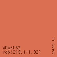 Цвет #DA6F52 в цветовой модели RGB обозначается тремя октетами (218, 111, 82) в десятичном формате и #DA6F52 в шестнадцатиричном (hex) формате, которые являются интенсивностью красного 218 (hex DA), интенсивность зелёного 111 (hex 6F) и интенсивность синего 82 (hex 52).