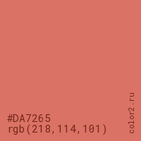 Цвет #DA7265 в цветовой модели RGB обозначается тремя октетами (218, 114, 101) в десятичном формате и #DA7265 в шестнадцатиричном (hex) формате, которые являются интенсивностью красного 218 (hex DA), интенсивность зелёного 114 (hex 72) и интенсивность синего 101 (hex 65).