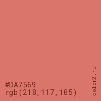 Цвет #DA7569 в цветовой модели RGB обозначается тремя октетами (218, 117, 105) в десятичном формате и #DA7569 в шестнадцатиричном (hex) формате, которые являются интенсивностью красного 218 (hex DA), интенсивность зелёного 117 (hex 75) и интенсивность синего 105 (hex 69).