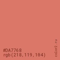 Цвет #DA7768 в цветовой модели RGB обозначается тремя октетами (218, 119, 104) в десятичном формате и #DA7768 в шестнадцатиричном (hex) формате, которые являются интенсивностью красного 218 (hex DA), интенсивность зелёного 119 (hex 77) и интенсивность синего 104 (hex 68).