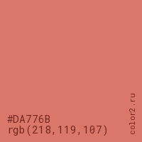 Цвет #DA776B в цветовой модели RGB обозначается тремя октетами (218, 119, 107) в десятичном формате и #DA776B в шестнадцатиричном (hex) формате, которые являются интенсивностью красного 218 (hex DA), интенсивность зелёного 119 (hex 77) и интенсивность синего 107 (hex 6B).