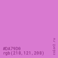 Цвет #DA79D0 в цветовой модели RGB обозначается тремя октетами (218, 121, 208) в десятичном формате и #DA79D0 в шестнадцатиричном (hex) формате, которые являются интенсивностью красного 218 (hex DA), интенсивность зелёного 121 (hex 79) и интенсивность синего 208 (hex D0).