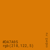 Цвет #DA7A05 в цветовой модели RGB обозначается тремя октетами (218, 122, 5) в десятичном формате и #DA7A05 в шестнадцатиричном (hex) формате, которые являются интенсивностью красного 218 (hex DA), интенсивность зелёного 122 (hex 7A) и интенсивность синего 5 (hex 05).