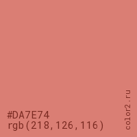 Цвет #DA7E74 в цветовой модели RGB обозначается тремя октетами (218, 126, 116) в десятичном формате и #DA7E74 в шестнадцатиричном (hex) формате, которые являются интенсивностью красного 218 (hex DA), интенсивность зелёного 126 (hex 7E) и интенсивность синего 116 (hex 74).