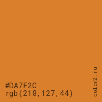 Цвет #DA7F2C в цветовой модели RGB обозначается тремя октетами (218, 127, 44) в десятичном формате и #DA7F2C в шестнадцатиричном (hex) формате, которые являются интенсивностью красного 218 (hex DA), интенсивность зелёного 127 (hex 7F) и интенсивность синего 44 (hex 2C).