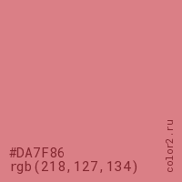 Цвет #DA7F86 в цветовой модели RGB обозначается тремя октетами (218, 127, 134) в десятичном формате и #DA7F86 в шестнадцатиричном (hex) формате, которые являются интенсивностью красного 218 (hex DA), интенсивность зелёного 127 (hex 7F) и интенсивность синего 134 (hex 86).