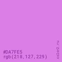 Цвет RGB(218, 127, 229) в процентом отношении количества цвета состоит из 85.5% красного (red), 49.8% зелёного (green) и 89.8% синего (blue).