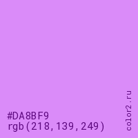 Цвет RGB(218, 139, 249) в процентом отношении количества цвета состоит из 85.5% красного (red), 54.5% зелёного (green) и 97.6% синего (blue).