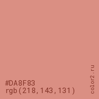 Цвет #DA8F83 в цветовой модели RGB обозначается тремя октетами (218, 143, 131) в десятичном формате и #DA8F83 в шестнадцатиричном (hex) формате, которые являются интенсивностью красного 218 (hex DA), интенсивность зелёного 143 (hex 8F) и интенсивность синего 131 (hex 83).