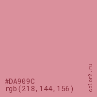 Цвет #DA909C в цветовой модели RGB обозначается тремя октетами (218, 144, 156) в десятичном формате и #DA909C в шестнадцатиричном (hex) формате, которые являются интенсивностью красного 218 (hex DA), интенсивность зелёного 144 (hex 90) и интенсивность синего 156 (hex 9C).