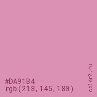 Цвет #DA91B4 в цветовой модели RGB обозначается тремя октетами (218, 145, 180) в десятичном формате и #DA91B4 в шестнадцатиричном (hex) формате, которые являются интенсивностью красного 218 (hex DA), интенсивность зелёного 145 (hex 91) и интенсивность синего 180 (hex B4).