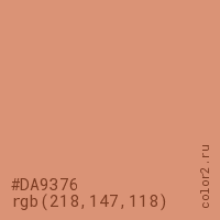 Цвет #DA9376 в цветовой модели RGB обозначается тремя октетами (218, 147, 118) в десятичном формате и #DA9376 в шестнадцатиричном (hex) формате, которые являются интенсивностью красного 218 (hex DA), интенсивность зелёного 147 (hex 93) и интенсивность синего 118 (hex 76).
