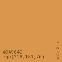 Цвет #DA964C в цветовой модели RGB обозначается тремя октетами (218, 150, 76) в десятичном формате и #DA964C в шестнадцатиричном (hex) формате, которые являются интенсивностью красного 218 (hex DA), интенсивность зелёного 150 (hex 96) и интенсивность синего 76 (hex 4C).