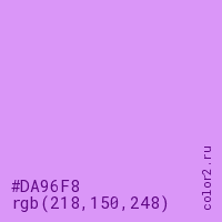 Цвет #DA96F8 в цветовой модели RGB обозначается тремя октетами (218, 150, 248) в десятичном формате и #DA96F8 в шестнадцатиричном (hex) формате, которые являются интенсивностью красного 218 (hex DA), интенсивность зелёного 150 (hex 96) и интенсивность синего 248 (hex F8).