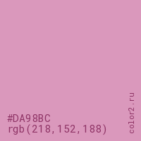 Цвет #DA98BC в цветовой модели RGB обозначается тремя октетами (218, 152, 188) в десятичном формате и #DA98BC в шестнадцатиричном (hex) формате, которые являются интенсивностью красного 218 (hex DA), интенсивность зелёного 152 (hex 98) и интенсивность синего 188 (hex BC).