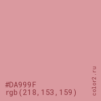 Цвет #DA999F в цветовой модели RGB обозначается тремя октетами (218, 153, 159) в десятичном формате и #DA999F в шестнадцатиричном (hex) формате, которые являются интенсивностью красного 218 (hex DA), интенсивность зелёного 153 (hex 99) и интенсивность синего 159 (hex 9F).