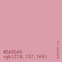 Цвет #DA9DA9 в цветовой модели RGB обозначается тремя октетами (218, 157, 169) в десятичном формате и #DA9DA9 в шестнадцатиричном (hex) формате, которые являются интенсивностью красного 218 (hex DA), интенсивность зелёного 157 (hex 9D) и интенсивность синего 169 (hex A9).
