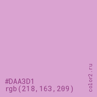 Цвет #DAA3D1 в цветовой модели RGB обозначается тремя октетами (218, 163, 209) в десятичном формате и #DAA3D1 в шестнадцатиричном (hex) формате, которые являются интенсивностью красного 218 (hex DA), интенсивность зелёного 163 (hex A3) и интенсивность синего 209 (hex D1).