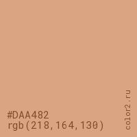 Цвет #DAA482 в цветовой модели RGB обозначается тремя октетами (218, 164, 130) в десятичном формате и #DAA482 в шестнадцатиричном (hex) формате, которые являются интенсивностью красного 218 (hex DA), интенсивность зелёного 164 (hex A4) и интенсивность синего 130 (hex 82).