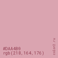 Цвет #DAA4B0 в цветовой модели RGB обозначается тремя октетами (218, 164, 176) в десятичном формате и #DAA4B0 в шестнадцатиричном (hex) формате, которые являются интенсивностью красного 218 (hex DA), интенсивность зелёного 164 (hex A4) и интенсивность синего 176 (hex B0).