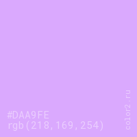 Цвет #DAA9FE в цветовой модели RGB обозначается тремя октетами (218, 169, 254) в десятичном формате и #DAA9FE в шестнадцатиричном (hex) формате, которые являются интенсивностью красного 218 (hex DA), интенсивность зелёного 169 (hex A9) и интенсивность синего 254 (hex FE).