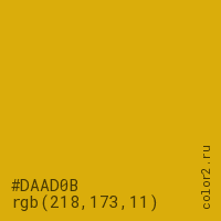 Цвет #DAAD0B в цветовой модели RGB обозначается тремя октетами (218, 173, 11) в десятичном формате и #DAAD0B в шестнадцатиричном (hex) формате, которые являются интенсивностью красного 218 (hex DA), интенсивность зелёного 173 (hex AD) и интенсивность синего 11 (hex 0B).