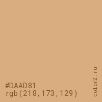 Цвет #DAAD81 в цветовой модели RGB обозначается тремя октетами (218, 173, 129) в десятичном формате и #DAAD81 в шестнадцатиричном (hex) формате, которые являются интенсивностью красного 218 (hex DA), интенсивность зелёного 173 (hex AD) и интенсивность синего 129 (hex 81).