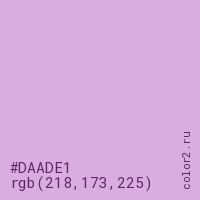 Цвет #DAADE1 в цветовой модели RGB обозначается тремя октетами (218, 173, 225) в десятичном формате и #DAADE1 в шестнадцатиричном (hex) формате, которые являются интенсивностью красного 218 (hex DA), интенсивность зелёного 173 (hex AD) и интенсивность синего 225 (hex E1).