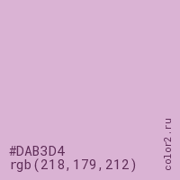 Цвет #DAB3D4 в цветовой модели RGB обозначается тремя октетами (218, 179, 212) в десятичном формате и #DAB3D4 в шестнадцатиричном (hex) формате, которые являются интенсивностью красного 218 (hex DA), интенсивность зелёного 179 (hex B3) и интенсивность синего 212 (hex D4).