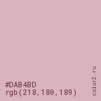 Цвет #DAB4BD в цветовой модели RGB обозначается тремя октетами (218, 180, 189) в десятичном формате и #DAB4BD в шестнадцатиричном (hex) формате, которые являются интенсивностью красного 218 (hex DA), интенсивность зелёного 180 (hex B4) и интенсивность синего 189 (hex BD).