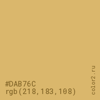 Цвет #DAB76C в цветовой модели RGB обозначается тремя октетами (218, 183, 108) в десятичном формате и #DAB76C в шестнадцатиричном (hex) формате, которые являются интенсивностью красного 218 (hex DA), интенсивность зелёного 183 (hex B7) и интенсивность синего 108 (hex 6C).