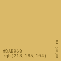 Цвет #DAB968 в цветовой модели RGB обозначается тремя октетами (218, 185, 104) в десятичном формате и #DAB968 в шестнадцатиричном (hex) формате, которые являются интенсивностью красного 218 (hex DA), интенсивность зелёного 185 (hex B9) и интенсивность синего 104 (hex 68).