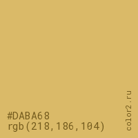 Цвет #DABA68 в цветовой модели RGB обозначается тремя октетами (218, 186, 104) в десятичном формате и #DABA68 в шестнадцатиричном (hex) формате, которые являются интенсивностью красного 218 (hex DA), интенсивность зелёного 186 (hex BA) и интенсивность синего 104 (hex 68).