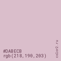 Цвет #DABECB в цветовой модели RGB обозначается тремя октетами (218, 190, 203) в десятичном формате и #DABECB в шестнадцатиричном (hex) формате, которые являются интенсивностью красного 218 (hex DA), интенсивность зелёного 190 (hex BE) и интенсивность синего 203 (hex CB).
