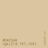 Цвет #DAC5A0 в цветовой модели RGB обозначается тремя октетами (218, 197, 160) в десятичном формате и #DAC5A0 в шестнадцатиричном (hex) формате, которые являются интенсивностью красного 218 (hex DA), интенсивность зелёного 197 (hex C5) и интенсивность синего 160 (hex A0).