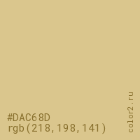 Цвет #DAC68D в цветовой модели RGB обозначается тремя октетами (218, 198, 141) в десятичном формате и #DAC68D в шестнадцатиричном (hex) формате, которые являются интенсивностью красного 218 (hex DA), интенсивность зелёного 198 (hex C6) и интенсивность синего 141 (hex 8D).